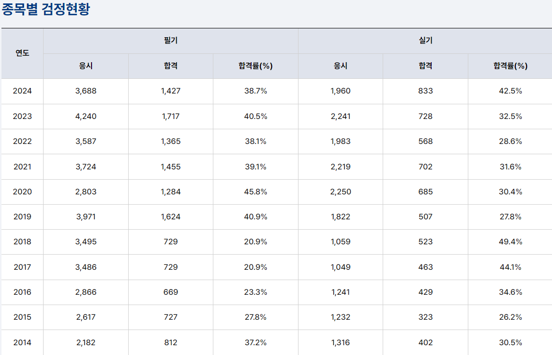 연도 필기 응시 필기 합격률(%) 실기 응시 실기 합격률(%)